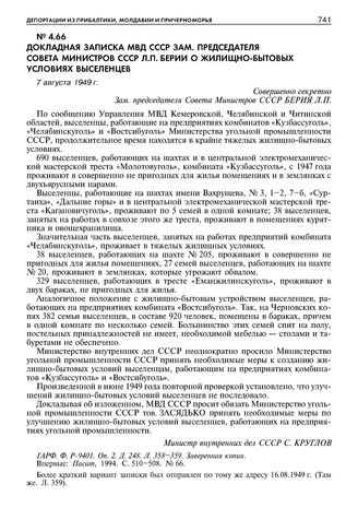 Докладная записка МВД СССР зам. председателя Совета Министров СССР Л.П. Берии о жилищно-бытовых условиях выселенцев. 7 августа 1949 г. // ГАРФ. Ф. Р-9401. Оп. 2. Д. 248. Л. 358-359. Заверенная копия; Пасат, 1994. С. 510-508. № 66.