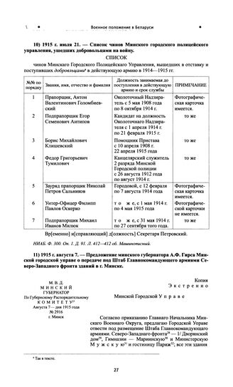 Список чинов Минского городского полицейского управления, ушедших добровольцами на войну. 1915 г. июля 21 // НИАБ. Ф. 300. Оп. 1. Д. 91. Л. 412-412 об. Машинописный.
