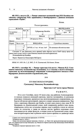 Рапорт двинского полицмейстера Н.В. Калайды витебскому губернатору М.В. Арцимовичу о бомбардировке г. Двинска немецким аэропланом «Таубе». 1915 г. августа 20 // НИАБ. Ф. 1430. Оп. 2. Д. 3602. Л. 43. Рукописный. На бланке. Копия.