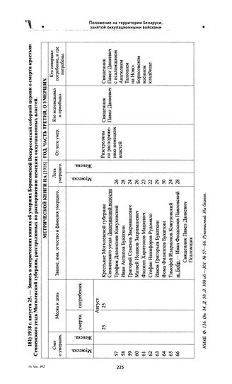 Запись в метрических книгах об умерших Борисовской Воскресенской соборной церкви о смерти крестьян Сенненского у. Могилевской губ., расстрелянных по распоряжению немецких оккупационных властей. 1918 г. августа 25 // НИАБ. Ф. 136. Оп. 34. Д. 50. Л. 300 об.-301. № 57-66. Рукописный. На бланке.