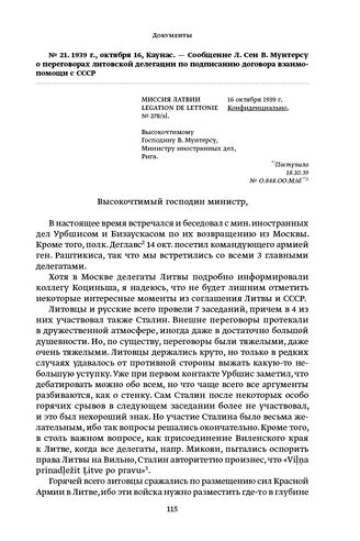 1939 г., октября 16, Каунас. — Сообщение Л. Сеи В. Мунтерсу о переговорах литовской делегации по подписанию договора взаимопомощи с СССР // ГИАЛ. Ф. 2574. Оп. 2. Д. 7390. Л. 272-275. Машинопись. Оригинал. Лат. яз.