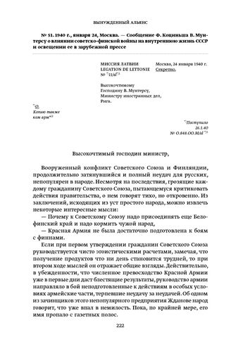 1940 г., января 24, Москва. — Сообщение Ф. Коциньша В. Мунтерсу о влиянии советско-финской войны на внутреннюю жизнь СССР и освещении ее в зарубежной прессе