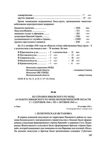 Из справки Ивьевского РО НКВД «О работе Ивьевского РО НКВД Молодечненской области с 1 сентября 1944 г. по 1 октября 1945 г.». м. Ивье, 20 октября 1945 г.