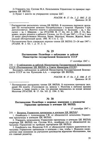 Постановление Политбюро о кадровых изменениях в руководстве Управления пропаганды и агитации ЦК ВКП(б). 17 сентября 1947 г. Протокол № 59