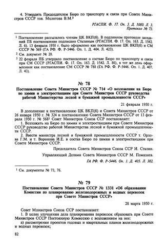 Постановление Совета Министров СССР № 1331 «Об образовании Комиссии по планированию железнодорожных и водных перевозок при Совете Министров СССР». 28 марта 1950 г. // ГА РФ. Ф. Р-5446. Оп. 1. Д. 411. Л. 247.