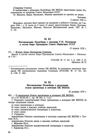 Постановление Политбюро о введении Г.М. Маленкова в состав Бюро Президиума Совета Министров СССР. 15 апреля 1950 г. Протокол № 73 // РГАСПИ. Ф. 17. Оп. 3. Д. 1080. Л. 93.