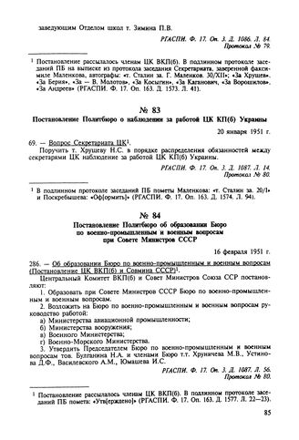 Постановление Политбюро об образовании Бюро по военно-промышленным и военным вопросам при Совете Министров СССР. 16 февраля 1951 г. Протокол № 80 // РГАСПИ. Ф. 17. Оп. 3. Д. 1087. Л. 56.