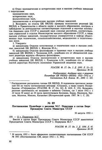 Постановление Политбюро о введении М.Г. Первухина в состав Бюро Президиума Совета Министров СССР. 30 августа 1952 г. Протокол № 89 // РГАСПИ. Ф. 17. Оп. 3. Д. 1096. Л. 41.