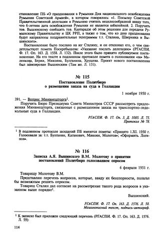 Постановление Политбюро о размещении заказа на суда в Голландии. 1 ноября 1950 г. Протокол № 78 // РГАСПИ. Ф. 17. Оп. 3. Д. 1085. Л. 75.