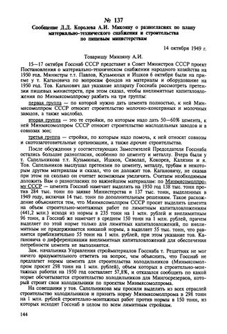 Сообщение Д.Д. Королева A.И. Микояну о разногласиях по плану материально-технического снабжения и строительства по пищевым министерствам. 14 октября 1949 г.