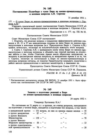 Постановление Политбюро о члене Бюро по военно-промышленным и военным вопросам А.Н. Сергееве. 31 декабря 1951 г. Протокол № 85 // РГАСПИ. Ф. 17. Оп. 3. Д. 1092. Л. 32, 155.