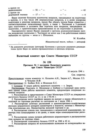 Главная Серия «Документы советской истории» Политбюро ЦК ВКП(б) и Совет Министров СССР. 1945-1953 Протокол № 1 заседания Валютного комитета при Совете Министров СССР...