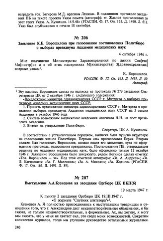 Заявление К.Е. Ворошилова при голосовании постановления Политбюро о выборах президиума Академии медицинских наук. 4 октября 1946 г.