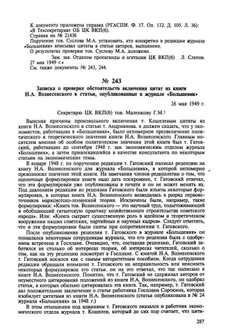 Записка о проверке обстоятельств включения цитат из книги Н.А. Вознесенского в статьи, опубликованные в журнале «Большевик». 26 мая 1949 г. // РГАСПИ. Ф. 17. Оп. 132. Д. 105. Л. 47-51. Машинописный текст.