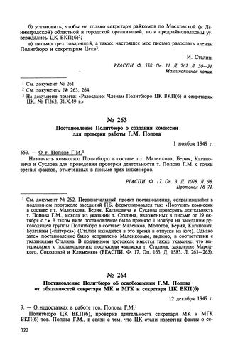 Постановление Политбюро о создании комиссии для проверки работы Г.М. Попова. 1 ноября 1949 г. Протокол № 71 // РГАСПИ. Ф. 17. Оп. 3. Д. 1078. Л. 98.