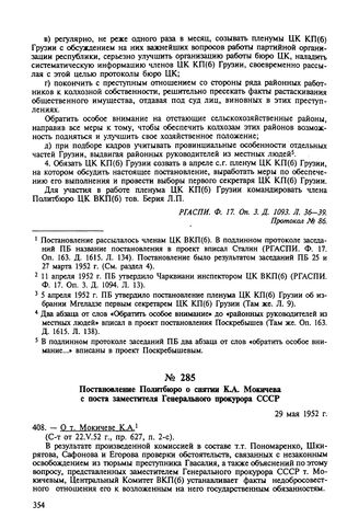 Постановление Политбюро о снятии К.А. Мокичева с поста заместителя Генерального прокурора СССР. 29 мая 1952 г. Протокол № 87 // РГАСПИ. Ф. 17. Оп. 3. Д. 1094. Л. 88-89.