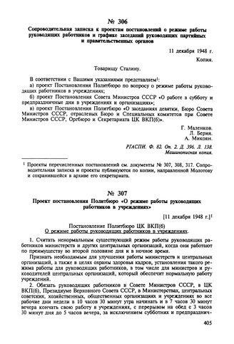 Сопроводительная записка к проектам постановлений о режиме работы руководящих работников и графике заседаний руководящих партийных и правительственных органов. 11 декабря 1948 г. // РГАСПИ. Ф. 82. Оп. 2. Д. 396. Л. 138. Машинописная копия.