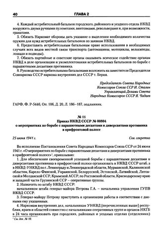 Приказ НКВД СССР № 00804 о мероприятиях по борьбе с парашютными десантами и диверсантами противника в прифронтовой полосе. 25 июня 1941 г.