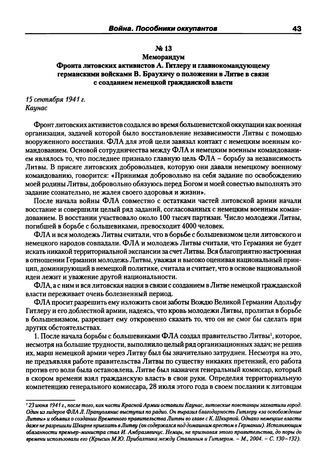 Меморандум Фронта литовских активистов А. Гитлеру и главнокомандующему германскими войсками В. Браухичу о положении в Литве в связи с созданием немецкой гражданской власти. 15 сентября 1941 г., Каунас // ЦА ФСБ РФ. Перевод с литовского. Опубликовано: Органы государственной безопасности СССР в Великой Отечественной войне. - Т. 2. - Кн. 2(1 сентября - 31 декабря 1941 г.). - С. 519-526.