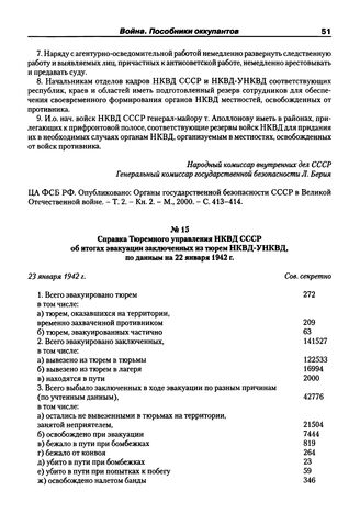 Справка Тюремного управления НКВД СССР об итогах эвакуации заключенных из тюрем НКВД-УНКВД, по данным на 22 января 1942 г. 23 января 1942 г.