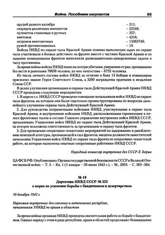 Директива НКВД СССР № 553 о мерах по усилению борьбы с бандитизмом и дезертирством. 10 декабря 1942 г. // ЦА ФСБ РФ. Опубликовано: Органы государственной безопасности СССР в Великой Отечественной войне. - Т. 3. - Кн. 2(1 июля - 31 декабря 1942 г.). - М., 2003. - С. 523-524.