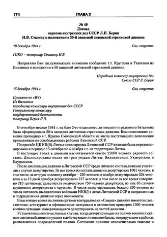 Доклад наркома внутренних дел СССР Л.П. Берия И.В. Сталину о положении в 50-й запасной литовской стрелковой дивизии. 18 декабря 1944 г. // ГАРФ, Ф. Р-9401, Oп. 2, Д. 68, Л. 179-182, заверенная копия.