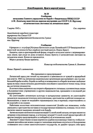Сообщение начальника Главного управления по борьбе с бандитизмом НКВД СССР А.М. Леонтьева заместителю наркома внутренних дел СССР С.Н. Круглову об антисоветских листовках на латышском языке. 7 марта 1945 г.