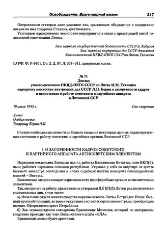Доклад уполномоченного НКВД-НКГБ СССР по Литве И.М. Ткаченко народному комиссару внутренних дел СССР Л.П. Берия о засоренности кадров и недостатках в работе советского и партийного аппарата в Литовской ССР. 19 июля 1945 г. // ГАРФ, Ф. Р-9401, Oп. 2, Д. 98, Л. 127-134, заверенная копия. Опубликовано: Лубянка. Сталин и НКВД-НКГБ-ГУКР «Смерш». 1939 - март 1946 / Архив Сталина. Документы высших органов партийной и государственной власти / Под общ. ред. акад. А.Н. Яковлева; Сост. В.Н. Хаустов, В.П. Наумов, Н.С. Плотникова. - М., 2006. - С. 528-532.