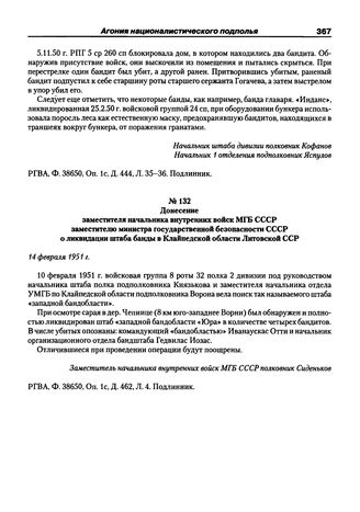 Донесение заместителя начальника внутренних войск МГБ СССР заместителю министра государственной безопасности СССР о ликвидации штаба банды в Клайпедской области Литовской ССР. 14 февраля 1951 г. // РГВА, Ф. 38650, Оп. 1с, Д. 462, Л. 4. Подлинник.