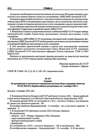 Справка об организации и численности националистических банд в западных областях УССР, БССР и Прибалтийских республиках на 1 октября 1951 г. Не ранее 1 октября 1951 года. // РГВА, Ф. 38650, Oп. 1, Д. 456, Л. 29-31. Подлинник.