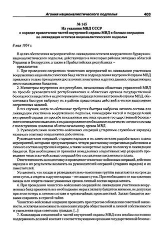 Из указания МВД СССР о порядке привлечения частей внутренней охраны МВД к боевым операциям по ликвидации остатков националистического подполья. 8 мая 1954 г. // ЦАВВ, Ф. 1, Оп. 9с, Д. 8, Л. 35-36. Заверенная копия.