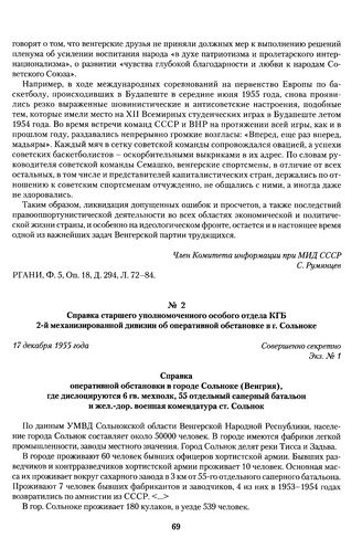 Справка старшего уполномоченного особого отдела КГБ 2-й механизированной дивизии об оперативной обстановке в г. Сольноке. 17 декабря 1955 года // ЦА ФСБ РФ, Ф. 153, Оп. 1, Д. 35, Л. 58, 62.