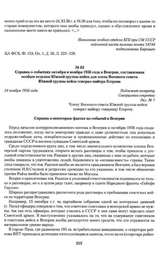 Справка о событиях октября и ноября 1956 года в Венгрии, составленная особым отделом Южной группы войск для члена Военного совета Южной группы войск генерал-майора Егорова. 24 ноября 1956 года