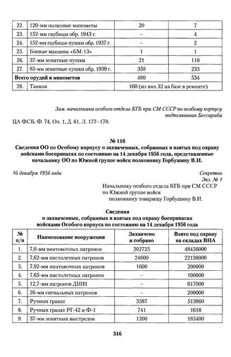 Главная Венгерские события 1956 года глазами КГБ и МВД СССР Сведения ОО по Особому корпусу о захваченных, собранных и взятых по...