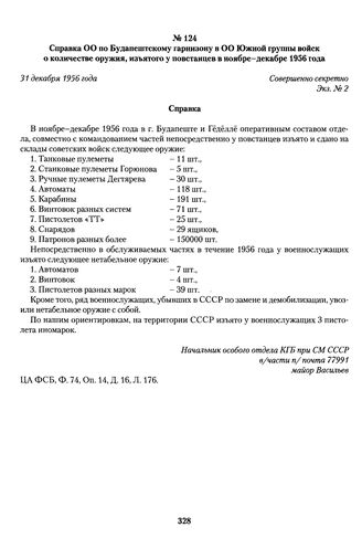 Справка ОО по Будапештскому гарнизону в ОО Южной группы войск о количестве оружия, изъятого у повстанцев в ноябре-декабре 1956 года. 31 декабря 1956 года // ЦА ФСБ, Ф. 74, Оп. 14, Д. 16, Л. 176.