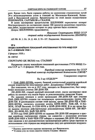 Сводка важнейших показаний арестованных по ГУГБ НКВД СССР за 7-8 февраля 1938 г. 8 февраля 1938 г. // АП РФ. Ф. 3. Оп. 24. Д. 404. Л. 108—137. Подлинник. Машинопись.