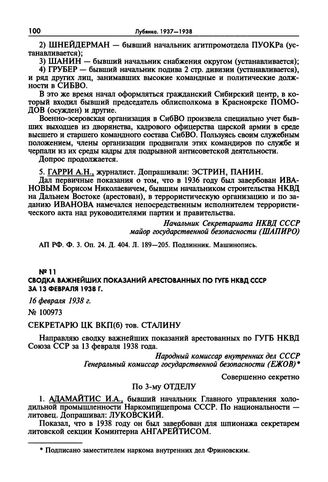 Сводка важнейших показаний арестованных по ГУГБ НКВД СССР за 13 февраля 1938 г. 16 февраля 1938 г. // АП РФ. Ф. 3. Оп. 24. Д. 405. Л.1—17. Подлинник. Машинопись.