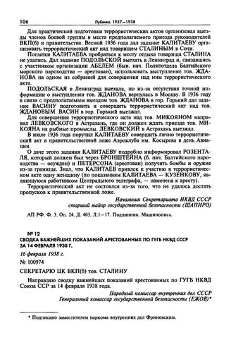Сводка важнейших показаний арестованных по ГУГБ НКВД СССР за 14 февраля 1938 г. 16 февраля 1938 г. // АП РФ. Ф. 3. Оп. 24. Д. 405. Л. 18—32. Подлинник. Машинопись.