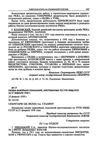 Сводка важнейших показаний арестованных по ГУГБ НКВД СССР за 21 февраля 1938 г. 25 февраля 1938 г. // АП РФ. Ф. 3. Оп. 24. Д. 405. Л. 83—96. Подлинник. Машинопись.