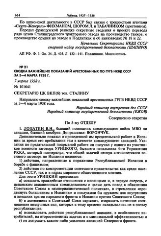 Сводка важнейших показаний арестованных по ГУГБ НКВД СССР за 3-4 марта 1938 г. 7 марта 1938 г.