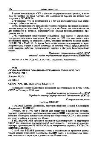 Сводка важнейших показаний арестованных по ГУГБ НКВД СССР за 7 марта 1938 г. 9 марта 1938 г. // АП РФ. Ф. 3. Оп. 24. Д. 406. Л. 1—9. Подлинник. Машинопись.