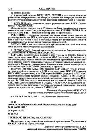 Сводка важнейших показаний арестованных по ГУГБ НКВД СССР за 13 марта 1938 г. 16 марта 1938 г. // АП РФ. Ф. 3. Оп. 24. Д. 406. Л. 10—32. Подлинник. Машинопись.
