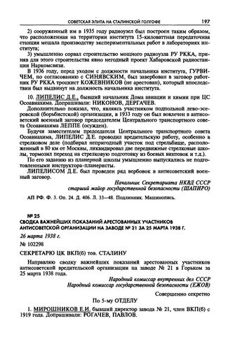 Сводка важнейших показаний арестованных участников антисоветской организации на заводе № 21 за 25 марта 1938 г. 26 марта 1938 г. // АП РФ. Ф. 3. Оп. 24. Д. 406. Л. 64—79. Подлинник. Машинопись.