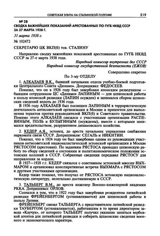 Сводка важнейших показаний арестованных по ГУГБ НКВД СССР за 27 марта 1938 г. 31 марта 1938 г. // АП РФ. Ф. 3. Оп.24. Д. 406. Л. 134—163. Подлинник. Машинопись.
