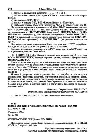 Сводка важнейших показаний арестованных по ГУГБ НКВД СССР за 7 апреля 1938 г. 7 апреля 1938 г. // АП РФ. Ф. 3. Оп. 24. Д. 407. Л. 157—176. Подлинник. Машинопись.