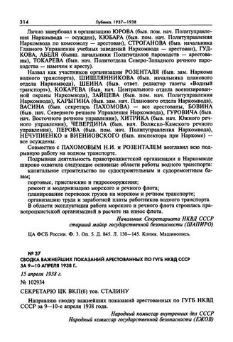 Сводка важнейших показаний арестованных по ГУГБ НКВД СССР за 9-10 апреля 1938 г. 15 апреля 1938 г. // АП РФ. Ф. 3. Оп. 24. Д. 408. Л. 1—13. Подлинник. Машинопись.