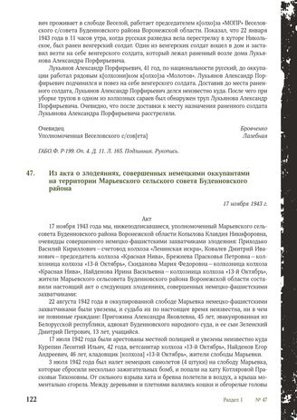 Из акта о злодеяниях, совершенных немецкими оккупантами на территории Марьевского сельского совета Буденновского района. 17 ноября 1943 г. // ГАБО. Ф. P-199. Оп. 4. Д. 11. Л. 91-91 об. Подлинник. Рукопись.
