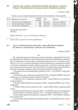 Список лиц, ставших жертвами немецких оккупантов, колхоза «Искра» Селивановского сельского совета Валуйского района. 11 февраля 1943 г. // ГАБО. Ф. P-169. Оп. 1. Д. 2. Л. 152. Подлинник. Рукопись.