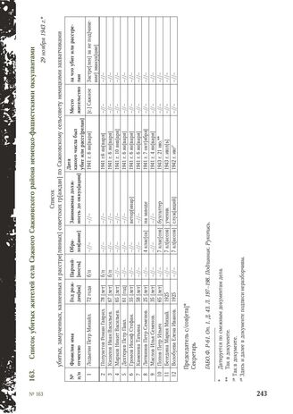 Список убитых жителей села Сажного Сажновского района немецко-фашистскими оккупантами. 29 ноября 1943 г. // ГАБО. Ф. P-61. Оп. 1. Д. 43. Л. 197-198. Подлинник. Рукопись.