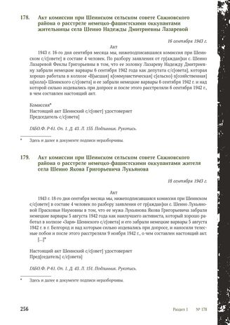Акт комиссии при Шеинском сельском совете Сажновского района о расстреле немецко-фашистскими оккупантами жителя села Шеино Якова Григорьевича Лукьянова. 18 сентября 1943 г. // ГАБО. Ф. P-61. Оп. 1. Д. 43. Л. 151. Подлинник. Рукопись.